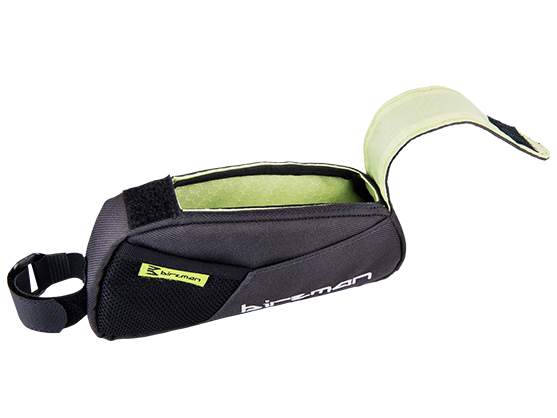 Uma bolsa de tamanho grande para o tubo superior do quadro desenhado para acesso fácil às tuas necessidades durante uma volta de bicicleta. Topo em velcro para acesso fácil às tuas ferramentas, barras energéticas, telemóvel, dinheiro ou qualquer outro pequeno equipamento, com uma pequena capa para maior proteção contra a chuva.